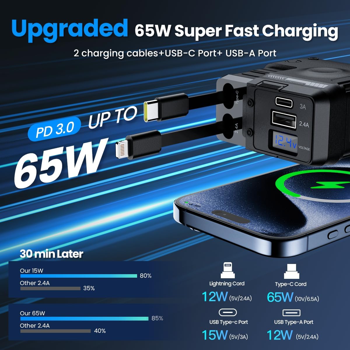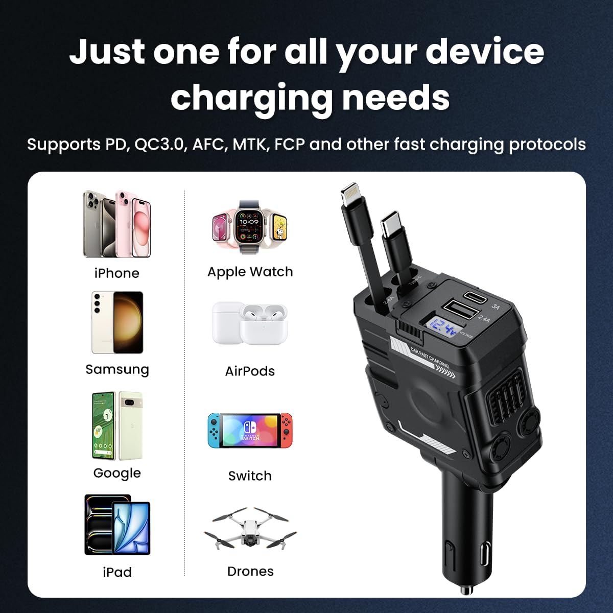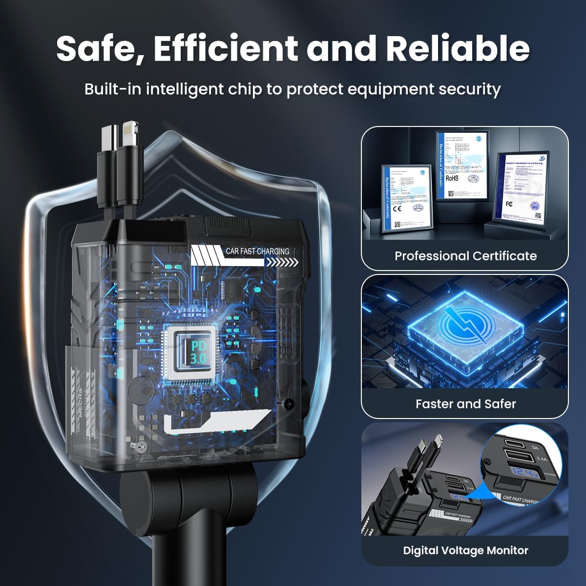 - ⚡【Fast Charging Four Devices Simultaneously】 Car charger retractable can charge smart phone and tablet devices quickly, efficiently and continuously. Equipped with two retractable car charging cables (PD Type C+ iP ) and two charging ports (USB A+ USB C). It can charge 4 devices at the same time and meet the charging needs of most electronic devices. With this car charger, customers do not need to place other chargers in the car. Charging speed is 3 times faster than other traditional car chargers