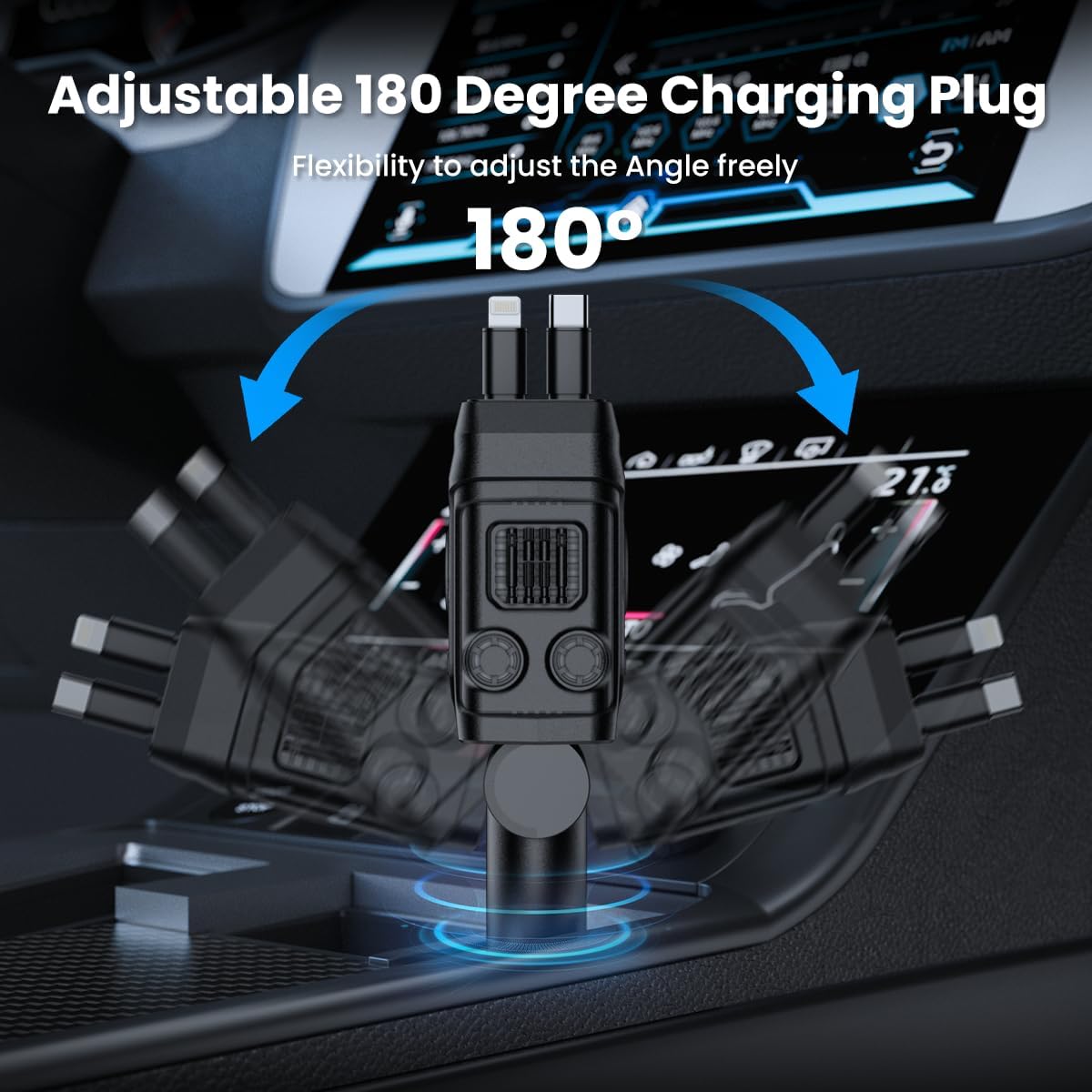 - ⚡【Mech-Style Retractable Car Charger】Car Phone Chager is equipped with two retractable cables (PD Type C+ iPhone) that can pull out a range of 80 cm and automatically retract internal storage to keep it clean and tidy. Equipped with an upgraded car charging head,it can be freely adjusted 180° from left to right to easily charge the rear seat.