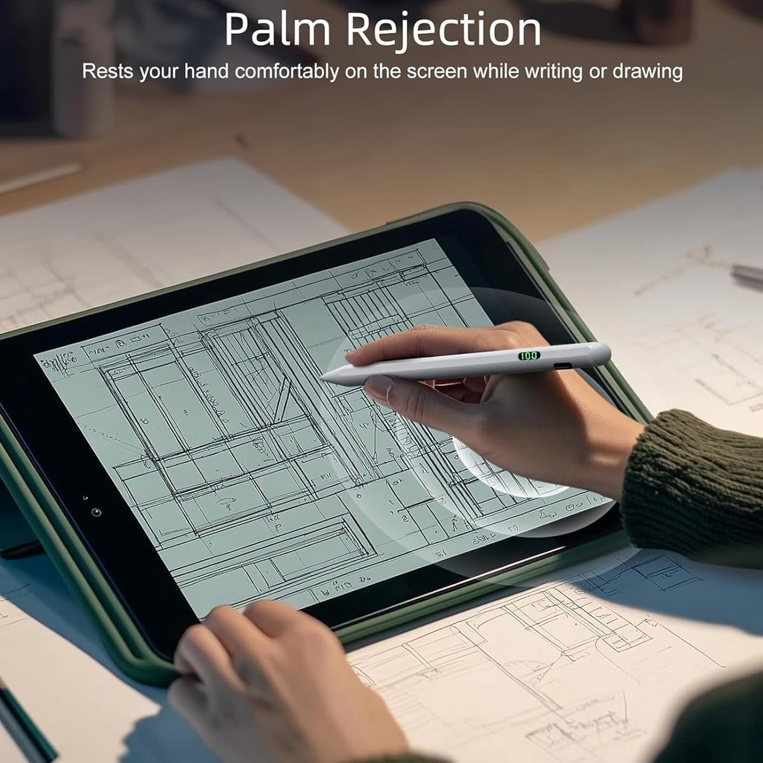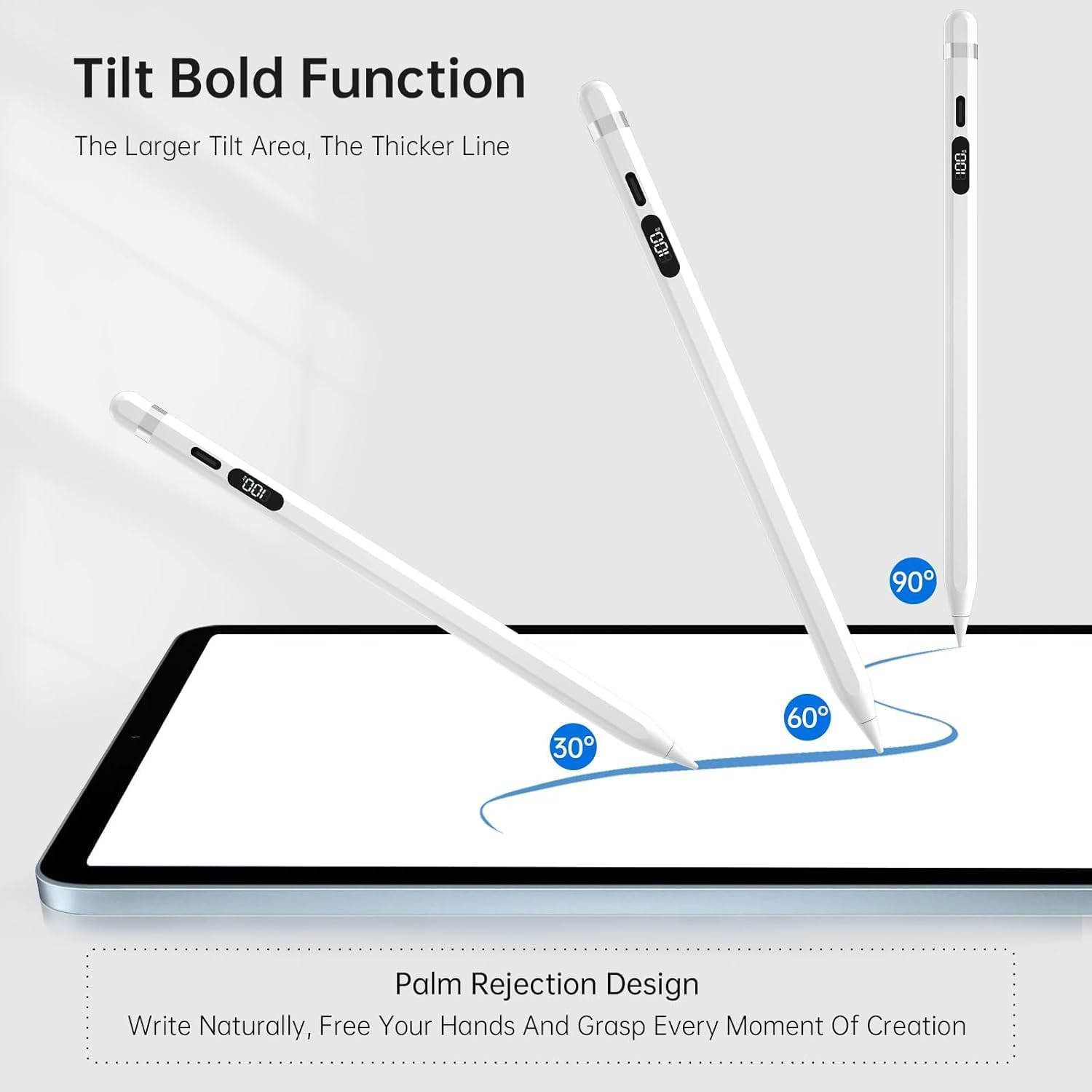 - Easy To Use: Double-click the switch on the top of the capacitive pen, the indicator light will light up the battery level will be displayed, and then it will enter the working mode. After displaying the power for 4 seconds, it enters energy-saving mode and displays "--". Click the top switch again to display the power. (Energy saving mode can work)