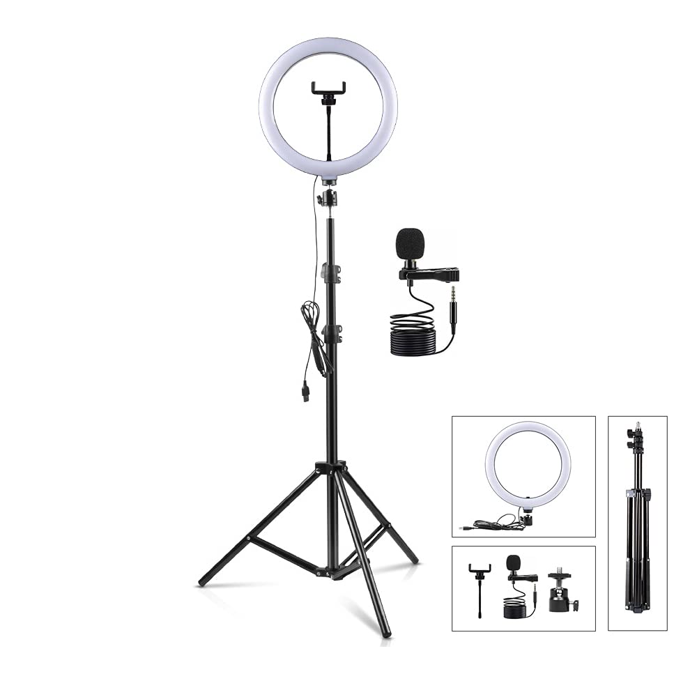- Professional Results: Achieve professional-quality lighting and audio in any setting, enhancing the quality and impact of your photos, videos, and live streams. Package Contains 1x 10 Inch Ring light, 7Foot height Adjustable tripod and a Lapel Collar Mic